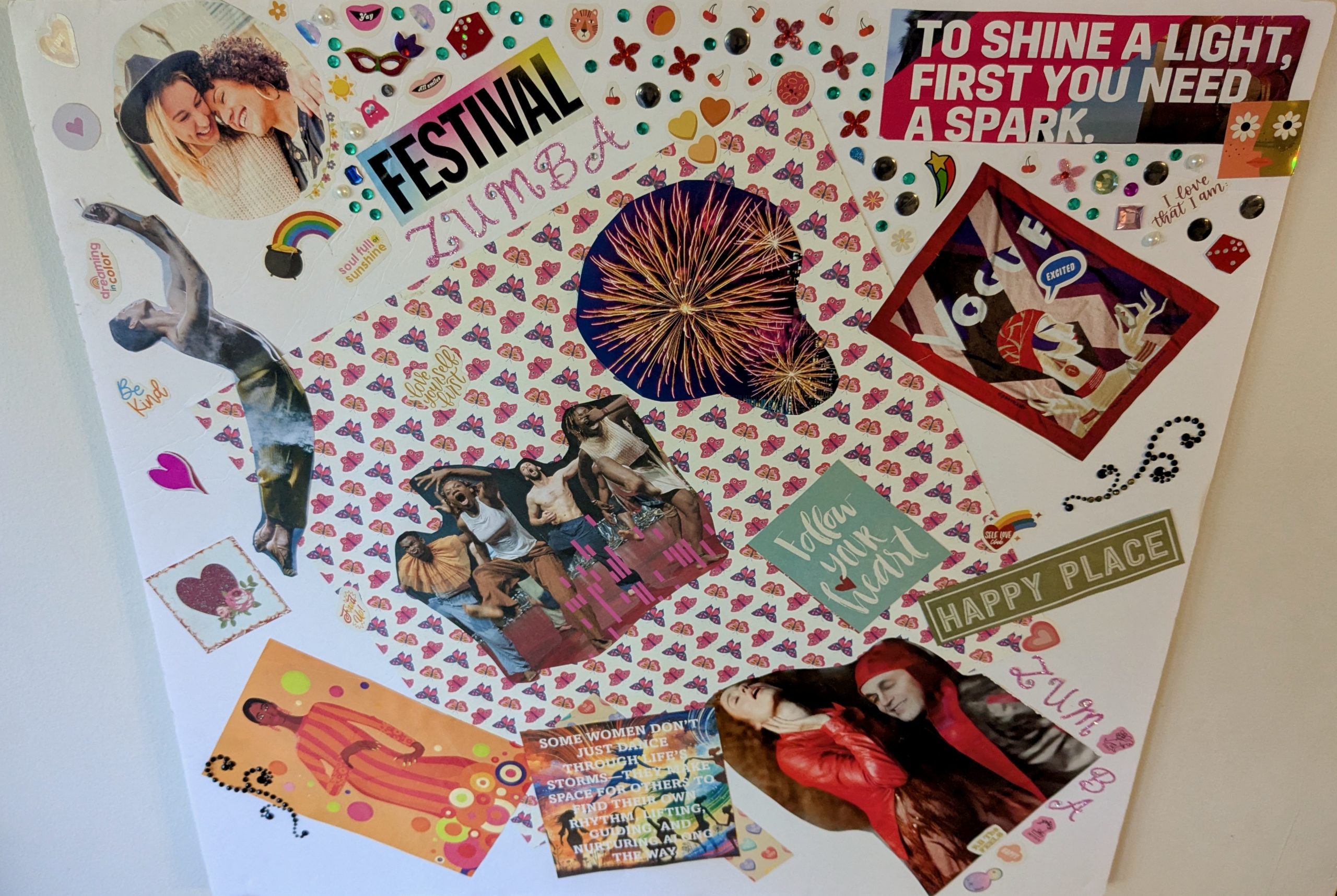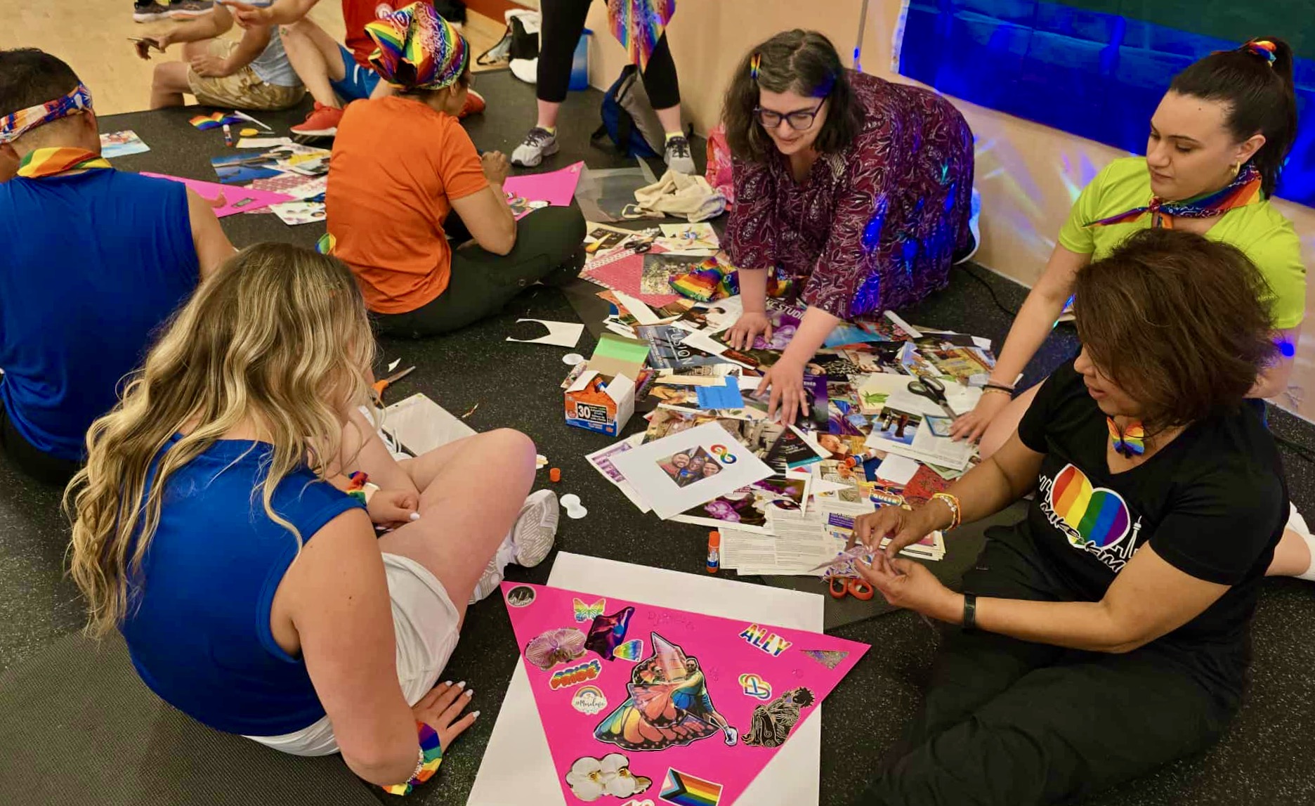 Still buzzing with energy from a dynamite Pride Zumba class, dancers gathered on stage to make collages that celebrate LGBTQIA+ community, passion, playfulness, and love.